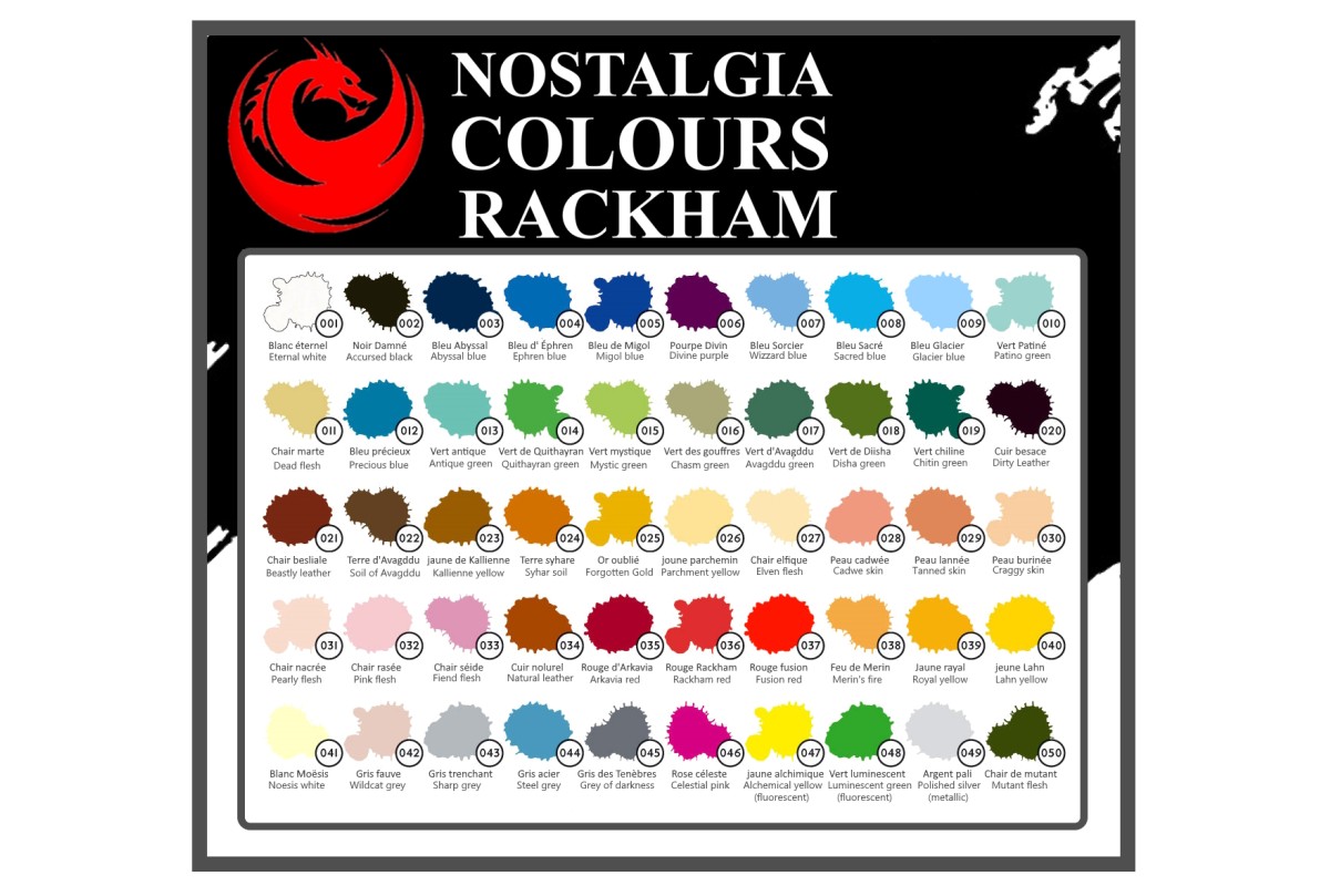 20 years ago, Rackham Entertainment (Confrontation) released their own range of paints, named Rackham Colors. The range was created with their unique miniatures in mind, and miniature artists sought solace in the warm embrace of Rackham's unique hues. With 'Nostalgia Colours Rackham', we bring back those cherished shades that inspired generations of artists. Delve into a palette that resonates with history, emotion, and innovation.